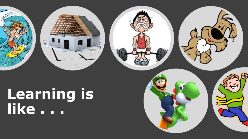 Let’s review! Learning is like building a house. You have to have a structure for incoming information to connect to. Learning is like working out–minor changes cause minor pain. Neurons tear down and build back stronger. It is challenging, but not a terribly painful process if done at the right rate. Learning is like a video game–mistakes are part of the challenge, and they help us to learn and progress. Learning is like surfing–a continual quest for the perfect wave, riding between static and chaos. Learning is like training an old dog. It is a constant effort to reconsider old learning habits and integrate new strategies and attitudes. Learning in all forms is possible, fun, and empowering!
