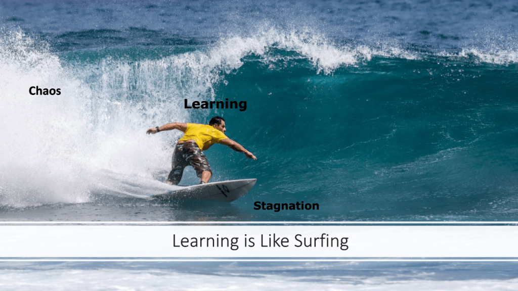 Learning is like surfing. You can feel when your learning is static. You may feel depressed or anxious, unfulfilled, antsy, or dissatisfied with life. These are all signs, Peterson says, that we feel static, or stagnant in life. When you are in chaos you may feel stressed or overwhelmed, you may lose sleep, or you may get sick as your immune system weakens. These are signs that we are in chaos. Peterson contends that whether consciously or not, we are always looking for the balance between static and chaos, life and death, knowledge and ignorance. Dr. Peterson compared this to surfing. Surfers are always trying to find the sweet spot on the wave between chaos ans static. We can also feel when we have found the balance in learning. We feel like things are going well. We feel happy and accomplished, yet still challenged. We feel gratified and interested in what we are doing and learning. We can feel the cognitive connections building and strengthening. We try to stay in that state, sometimes trying and failing multiple times as learning progresses, but we don’t feel we are suffering. We feel we are learning. It is exhilarating, and it is FUN!